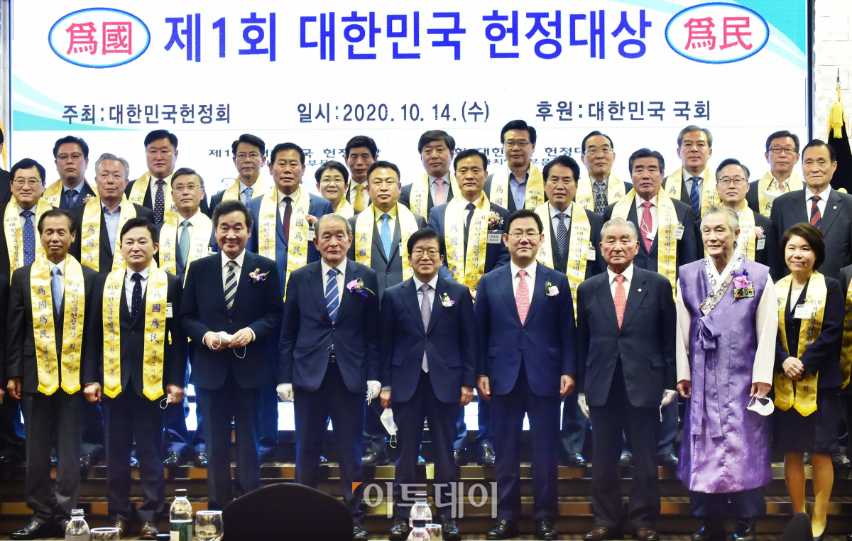 박병석 국회의장, 이낙연 더불어민주당 대표, 주호영 국민의힘 원내대표, 유경현 헌정회장 등이 14일 서울 영등포구 여의공원로 CCMM빌딩에서 열린 대한민국헌정대상 시상식에서 기념촬영을 하고 있다.