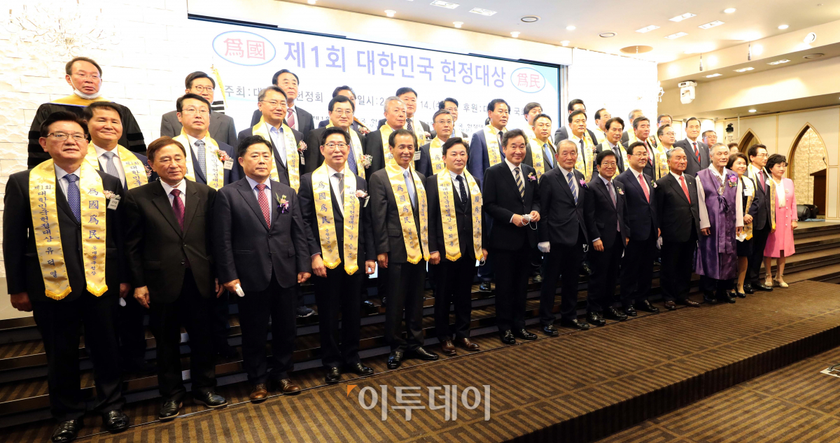 박병석 국회의장, 이낙연 더불어민주당 대표, 주호영 국민의힘 원내대표가 '1회 대한민국 헌정대상' 자치행정부문 시상식이 열린 14일 오전 서울 여의도 CCMM빌딩에서 수상자들과 기념찰영을 하고 있다.