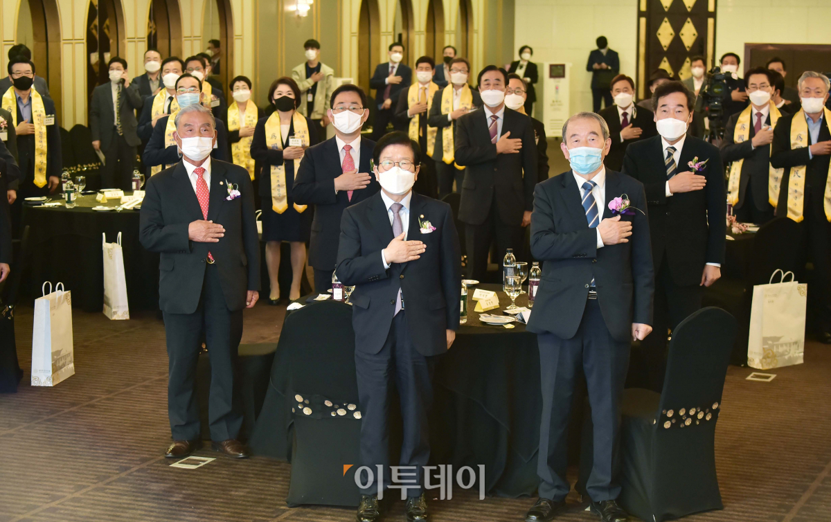 박병석 국회의장, 이낙연 더불어민주당 대표, 주호영 국민의힘 원내대표, 유경현 헌정회장 등 인사들이 14일 서울 영등포구 여의공원로 CCMM빌딩에서 열린 대한민국헌정대상 시상식에서 국민의례를 하고 있다.