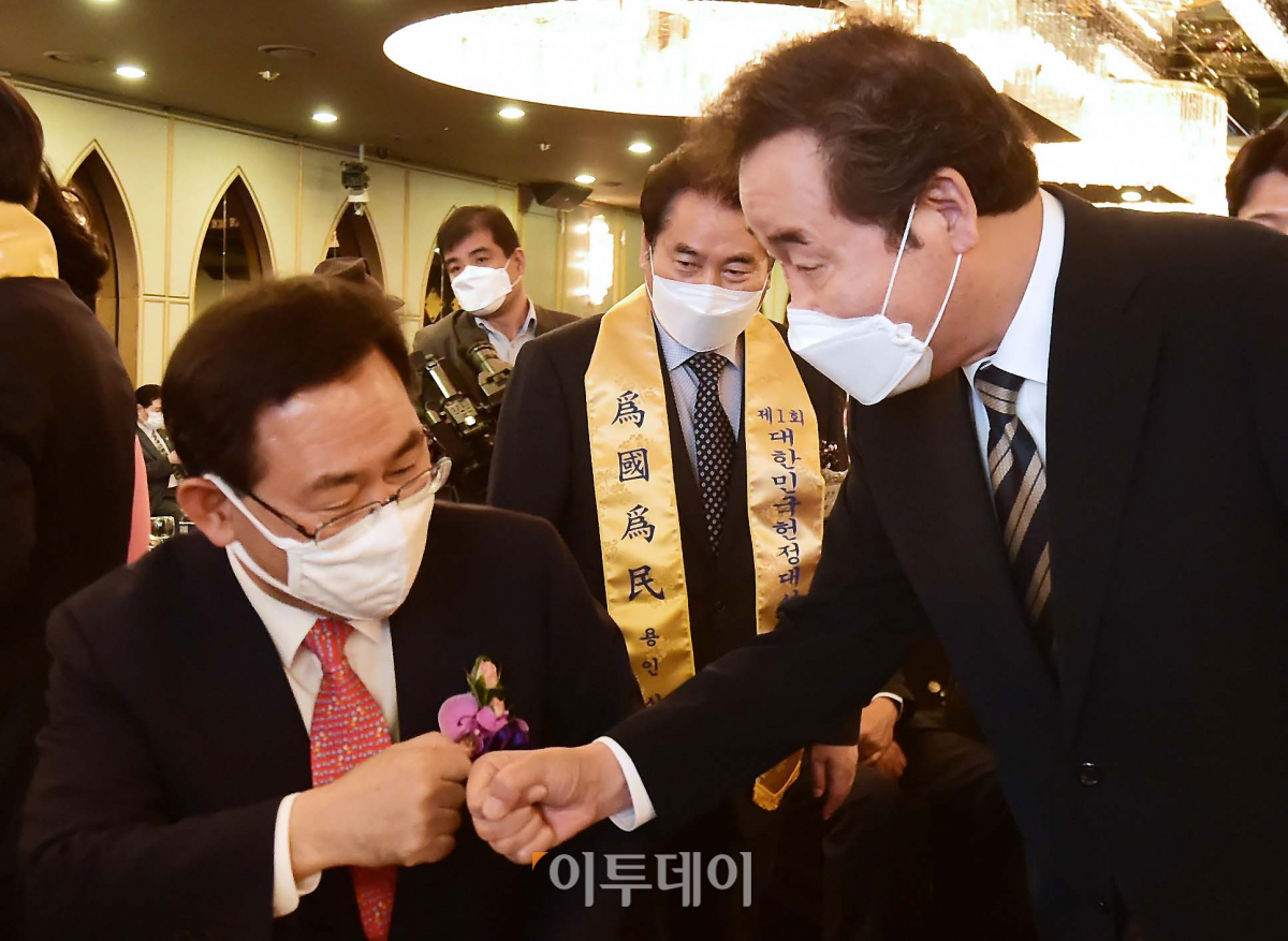 이낙연 더불어민주당 대표, 주호영 국민의힘 원내대표가 14일 서울 영등포구 여의공원로 CCMM빌딩에서 열린 대한민국헌정대상 시상식에서 인사를 나누고 있다.