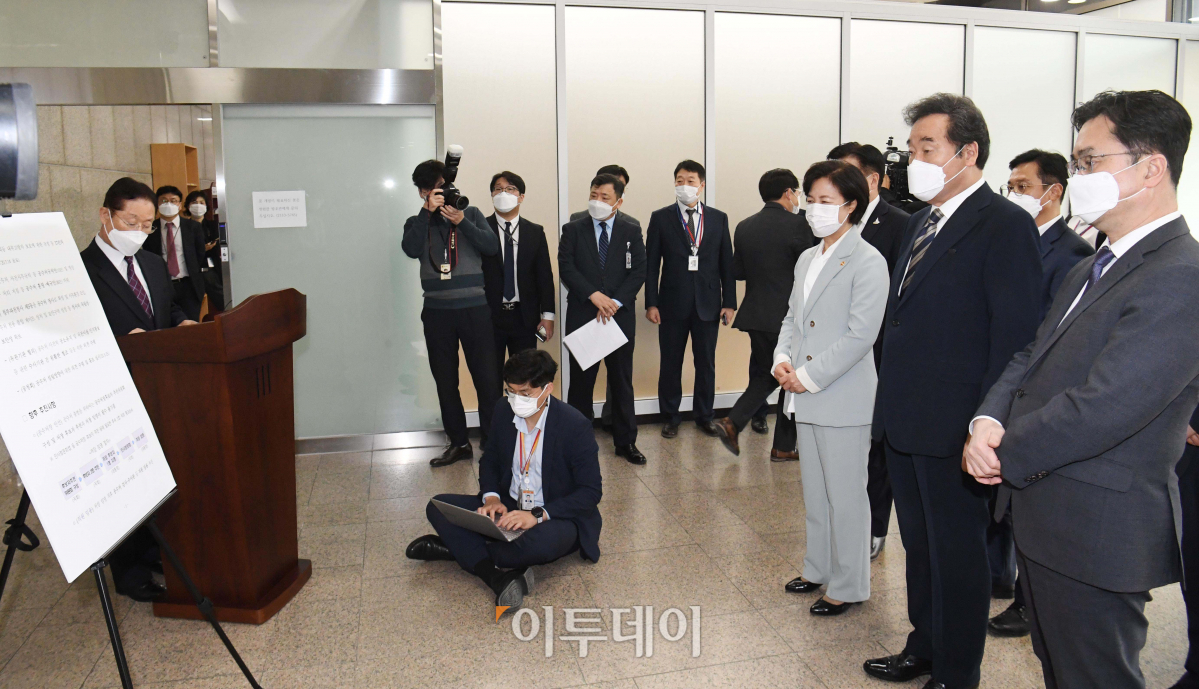 더불어민주당 이낙연대표가 14일 오후 정부과천청사에 마련된 공수처 입주청사를 방문하여 남기명 공수처 설립 준비단장으로부터 브리핑을 받고 있다. 국회사진취재단