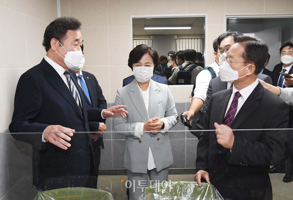 더불어민주당 이낙연대표가 14일 오후 정부과천청사에 마련된 공수처 입주청사를 방문하여 시설물을 둘러보고 있다. 왼쪽부터 이대표 추미애법부장관 남기명 공수처 설립 준비단장. 국회사진취재단