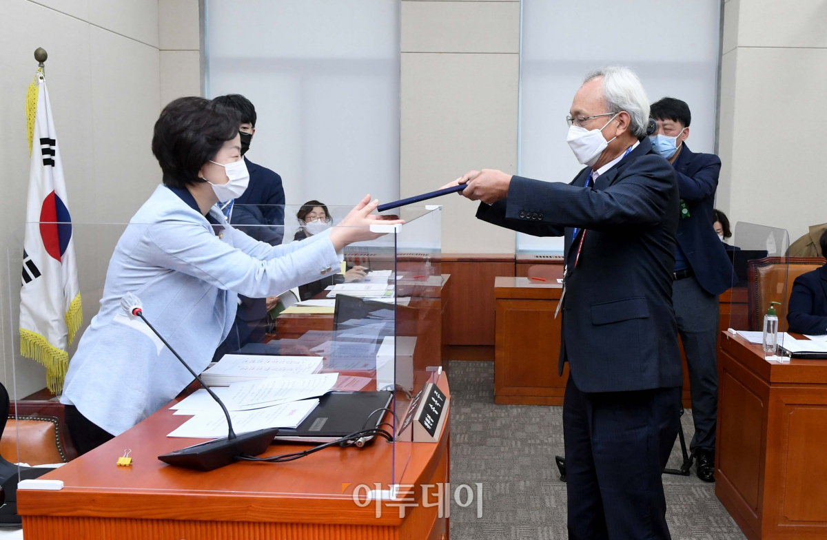 문성현 경제사회노동위원장이 15일 서울 여의도 국회에서 열린 환경노동위원회 국정감사에서 송옥주 위원장에게 선서문을 전달하고 있다.