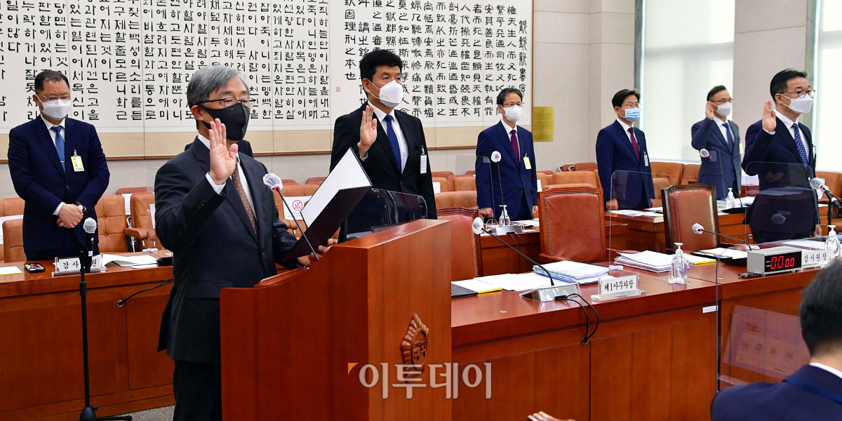 최재형 감사원장이 15일 국회에서 열린 법제사법위원회의 감사원에 대한 국정감사에서 증인선서를 하고 있다.