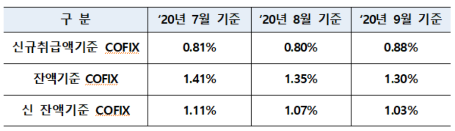 잔액 기준 코픽스는 8월 1.35%에서 9월 1.30%로 0.05%p 낮아졌다. 신규취급액, 잔액 기준 코픽스에는 정기예금, 정기적금, 상호부금, 주택부금, 양도성예금증서, 환매조건부채권매도, 표지어음매출, 금융채(후순위채 및 전환사채 제외) 수신상품의 금리가 반영된다.
