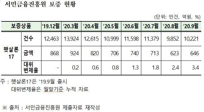 햇살론17이 출시된 지 1년 밖에 되지 않았고 지난 4월 발표된 '취약 개인채무자 재기지원 강화방안'에 따라 4월 29일부터 원금 상환유예가 적용됐다는 점을 감안했을 때, 햇살론17의 대위변제율 상승은 유의할 필요가 있다는 지적이다.