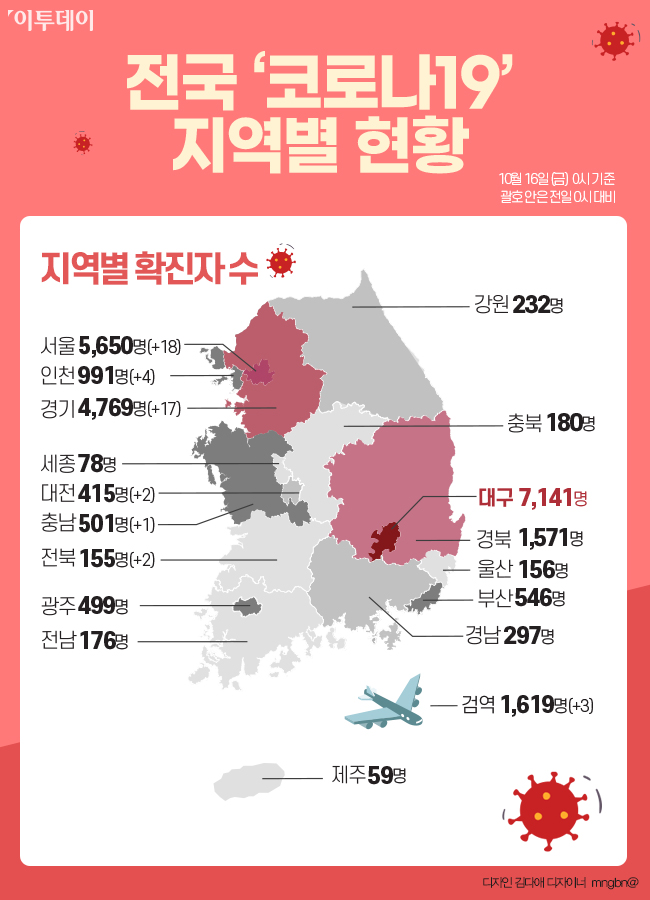 이로써 전국 시·도별 '코로나19' 확진자 수는 △대구 7141명 △서울 5650명으로 가장 많은 비중을 차지했다. 이어 △경기 4769명 △검역소 1619명 △경북 1571명 △인천 991명 △부산 546명 △충남 501명 △광주 499명 △대전 415명 △경남 297명 △강원 232명 △충북 180명 △전남 176명 △울산 156명 △전북 155명 △세종 78명 △제주 59명 순으로 나타났다.