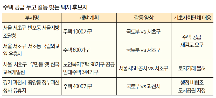 택지 조성을 둘러싼 갈등은 광역-기초자치단체 사이에서도 벌어지고 있다. 서초구는 관내 우면동 옛 한국교육개발원 부지를 서울주택도시공사(SH공사)가 사들이는 것을 불허했다. 서울시와 SH공사는 교육개발원이 충북 진천으로 이전하면서 빈 건물과 땅을 사들여 노인복지주택 98가구와 공공임대주택 344가구를 지으려 했다. 개발제한구역(그린벨트)으로 묶여 있는 교육개발개발원 부지를 매매하려면 관할 지자체인 서초구 허가가 필요하다.