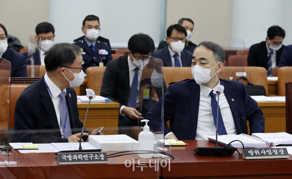 왕정홍 방위사업청장(오른쪽)과 남세규 국방과학연구소장이 20일 서울 여의도 국회에서 열린 국방위원회의 방위사업청, 국방과학연구소 등에 대한 국정감사에 출석해 대화를 나누고 있다.