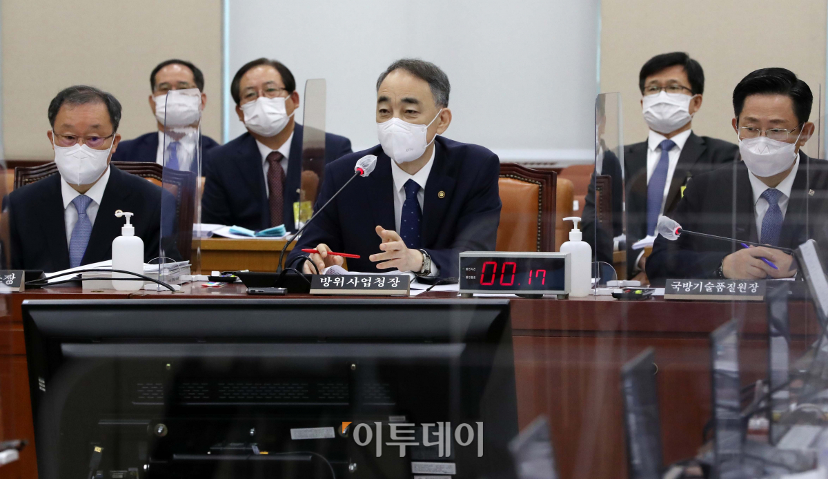 왕정홍 방위사업청장이 20일 국회 국방위원회의 방위사업청에 대한 국정감사에 출석해 의원들의 질의에 답변하고 있다.