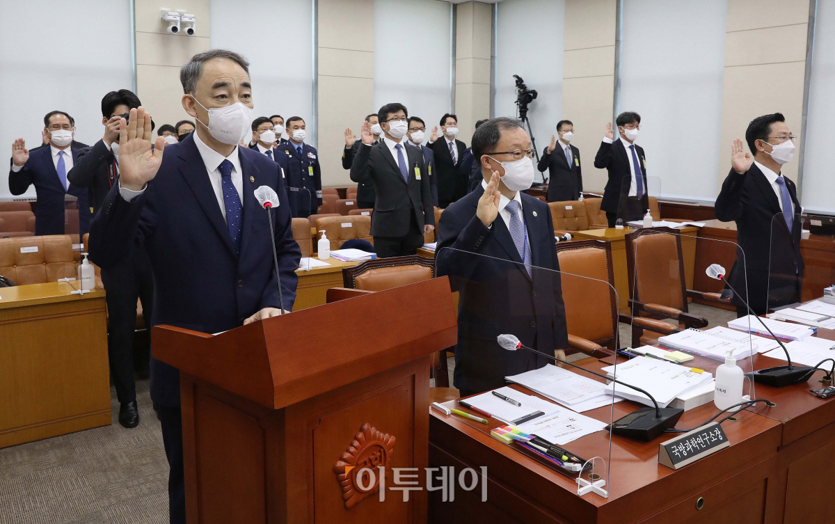 왕정홍 방위사업청장(왼쪽)이 20일 서울 여의도 국회에서 열린 국방위원회의 방위사업청, 국방과학연구소 등에 대한 국정감사에 출석해 선서를 하고 있다.