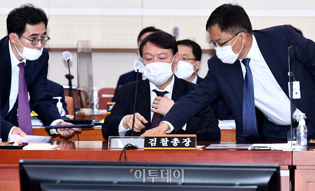 윤석열(가운데) 검찰총장이 22일 서울 여의도 국회에서 열린 법제사법위원회의 대검찰청에 대한 국정감사에서 조남관 차장검사와 대화하고 있다.