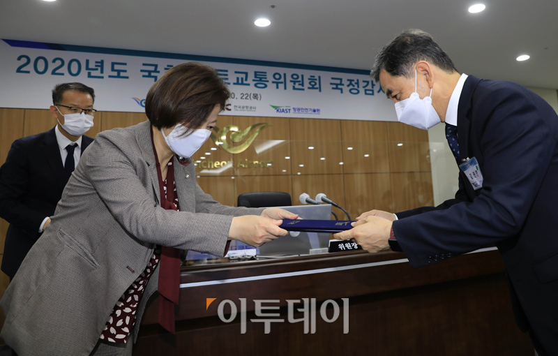 김연명 항공안전기술원장이 22일 오전 인천 중구 인천국제공항공사에서 열린 국토교통위원회의 인천국제공항공사, 한국공항공사, 항공안전기술원에 대한 국정감사에서 선서문을 진선미 국토교통위 감사위원장에게 전달하고 있다. 사진공동취재단