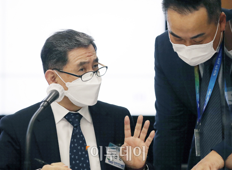 김연명 항공안전기술원장이 22일 오전 인천 중구 인천국제공항공사에서 열린 국토교통위원회의 인천국제공항공사, 한국공항공사, 항공안전기술원에 대한 국정감사를 시작하기 전 관계자와 대화하고 있다. 사진공동취재단