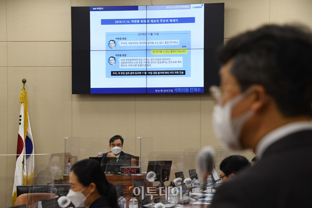 박현종(뒷모습) BHC회장이 22일 국회에서 열린 정무위원회 국정감사에서 증인으로 출석해 더불어민주당 전재수의원이 제시한 카톡 메세지에 대한 질문에 답변하고 있다.