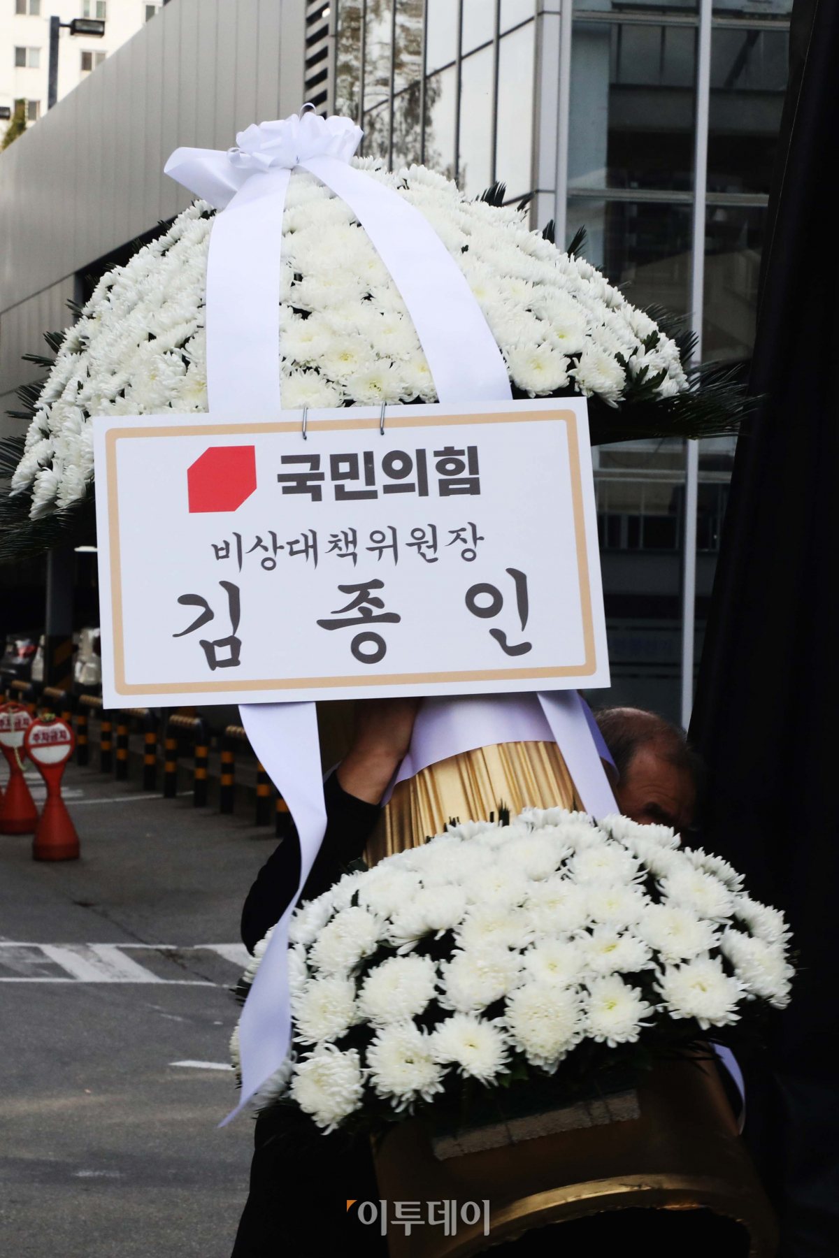 이건희 삼성그룹 회장이 별세한 25일 서울 강남구 삼성서울병원 장례식장에 김종인 국민의힘 비상대책위원장이 보낸 근조화환이 도착하고 있다.