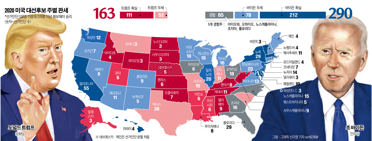 2016년 대선 때처럼 이번에도 경합주가 최대 변수로 작용하고 있다. 바이든 후보는 선거운동 기간 내내 트럼프 대통령에게 지지율에서 앞서왔다. 하지만 2016년 대선 때 민주당 힐러리 클린턴 후보가 각종 여론조사에서 우위를 싹쓸이하고도 결국 패한 탓에 불확실성은 여전하다. 당시 클린턴은 트럼프보다 286만 표를 더 얻었지만, 6개 경합주를 싹쓸이한 트럼프가 선거인단 과반인 270명을 훌쩍 넘는 306명을 확보해 최종 승리했다.