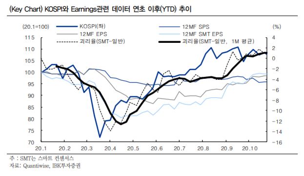 이에 코스피는 현재 탑라인(매출액) 보다 바텀라인(순이익) 상향이 일어나고 있는 상황이다. 테크니컬과 펀더멘털 관점에서도 지수상승은 2021년까지 지속될 전망이라고 IBK투자증권은 내다봤다.