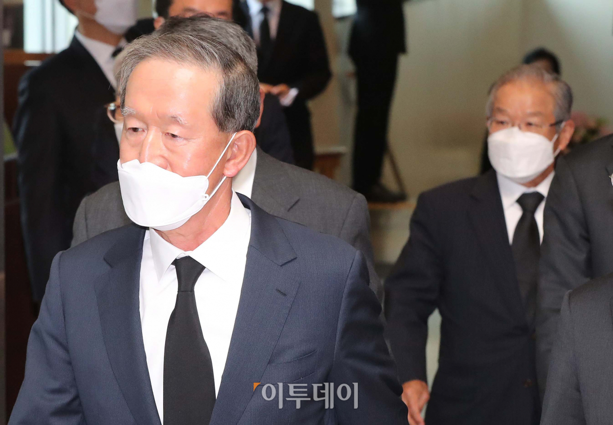 허창수 전경련 회장이 27일 오후 서울 강남구 삼성서울병원 장례식장에 마련된 고 이건희 삼성그룹 회장의 빈소를 조문한 뒤 나서고 있다. 오른쪽은 권태신 전경련 부회장. 사진공동취재단