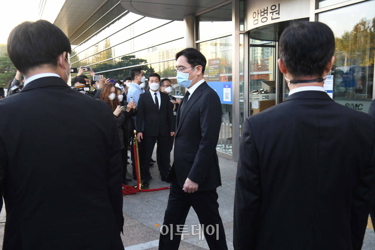 이재용 삼성전자 부회장이 28일 오전 삼성서울병원 암병원 강당에서 열린 영결식을 마치고 장례식장으로 이동 하기 위해 버스로 향하고 있다. 사진공동취재단