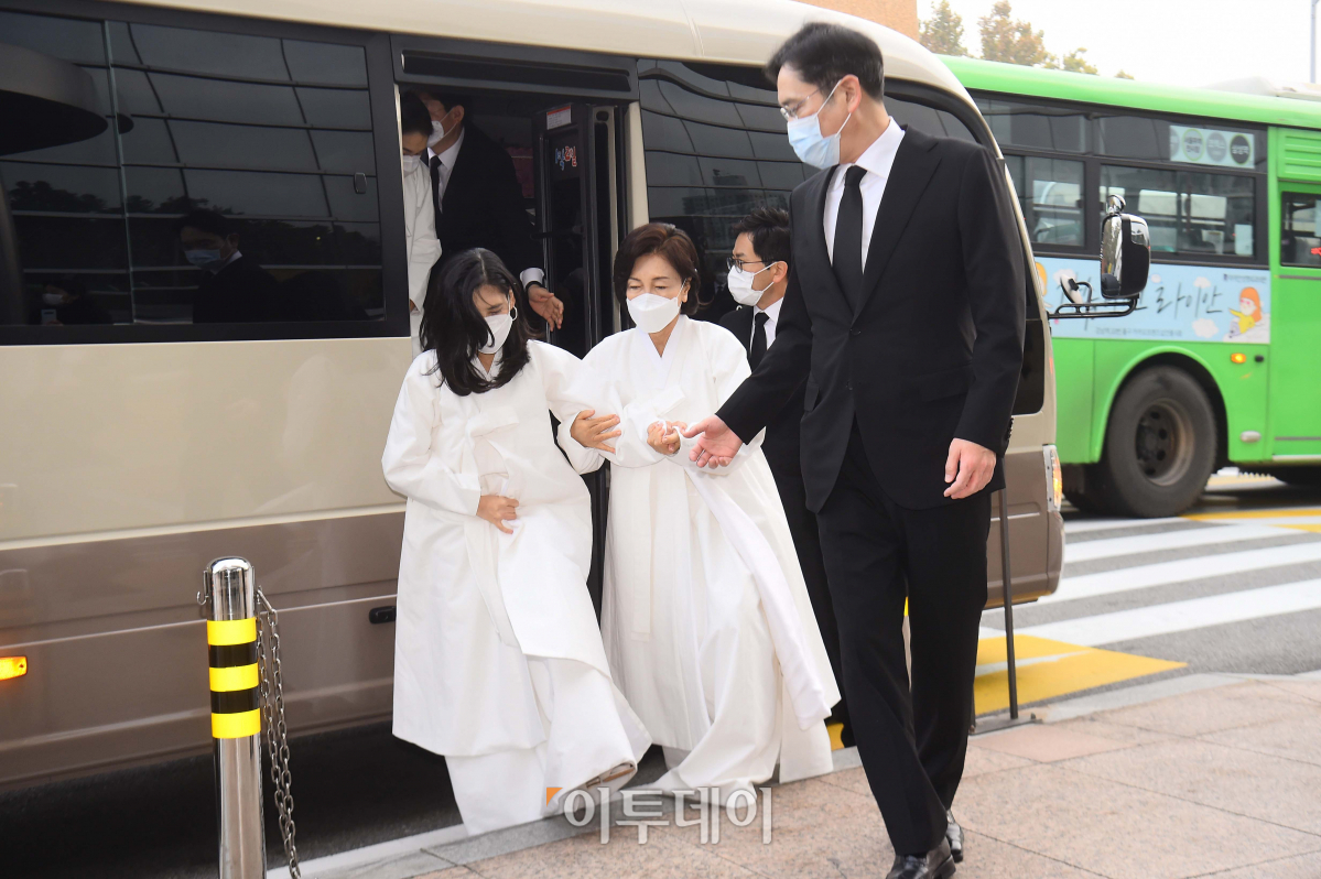고(故) 이건희 삼성그룹 회장의 영결식이 28일 오전 삼성서울병언 장례식장에서 비공개로 열린 가운데 홍라희 전 리움미술관장과 이재용 삼성전자 부회장, 이부진 호텔신라 사장, 이서현 삼성복지재단 이사장 등 유족들이 참석하고 있다. 사진공동취재단