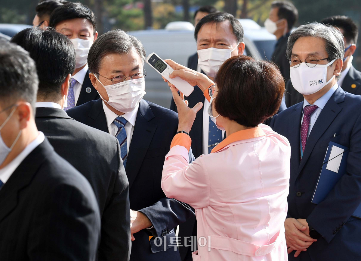 문재인 대통령이 2021년도 정부 예산안 처리를 위한 시정연설을 위해 28일 오전 서울 여의도 국회 본청으로 들어서며 체온 측정을 하고 있다.