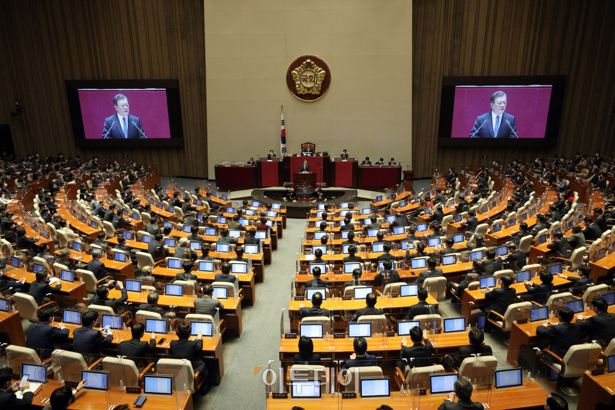 문재인 대통령이 28일 오전 서울 여의도 국회에서 2021년도 예산안 시정연설을 하고 있다.