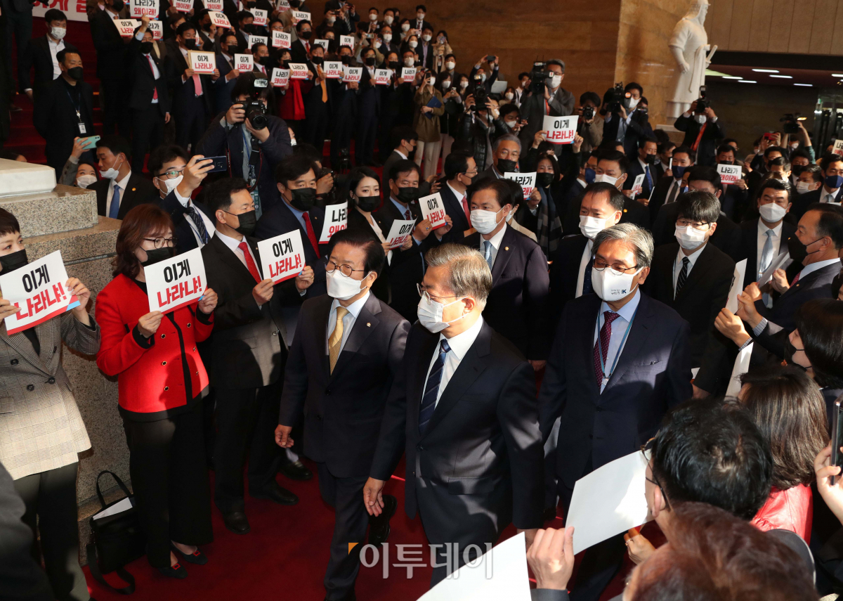 [포토] 국민의힘 항의 속 입장하는 문재인 대통령