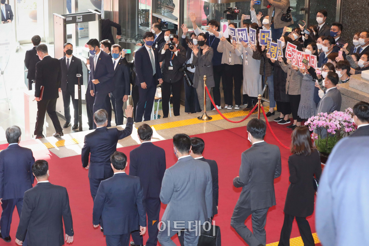 [포토] 민주당 당직자들 환호 받는 문재인 대통령