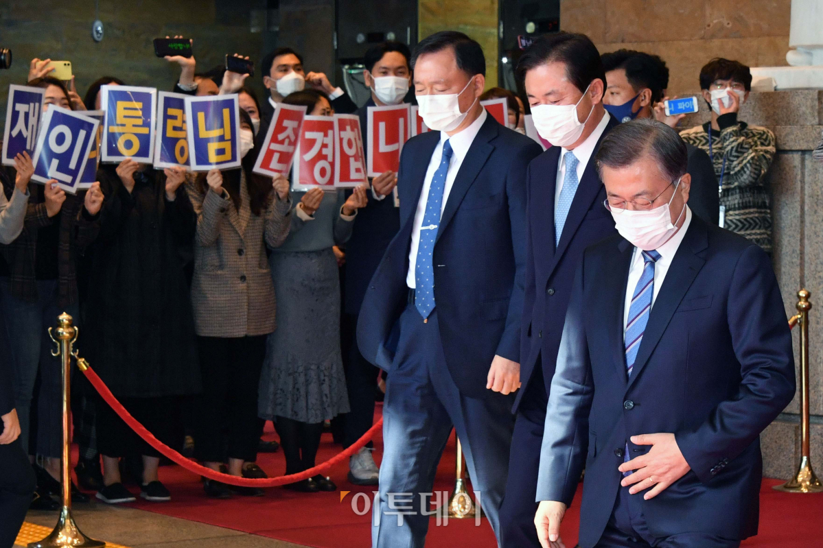 문재인 대통령이 28일 오전 서울 여의도 국회 본회의장에서 20201년도 예산안 시정연설을 마친 후 지지자들의 환호를 받으며 국회를 나서고 있다.