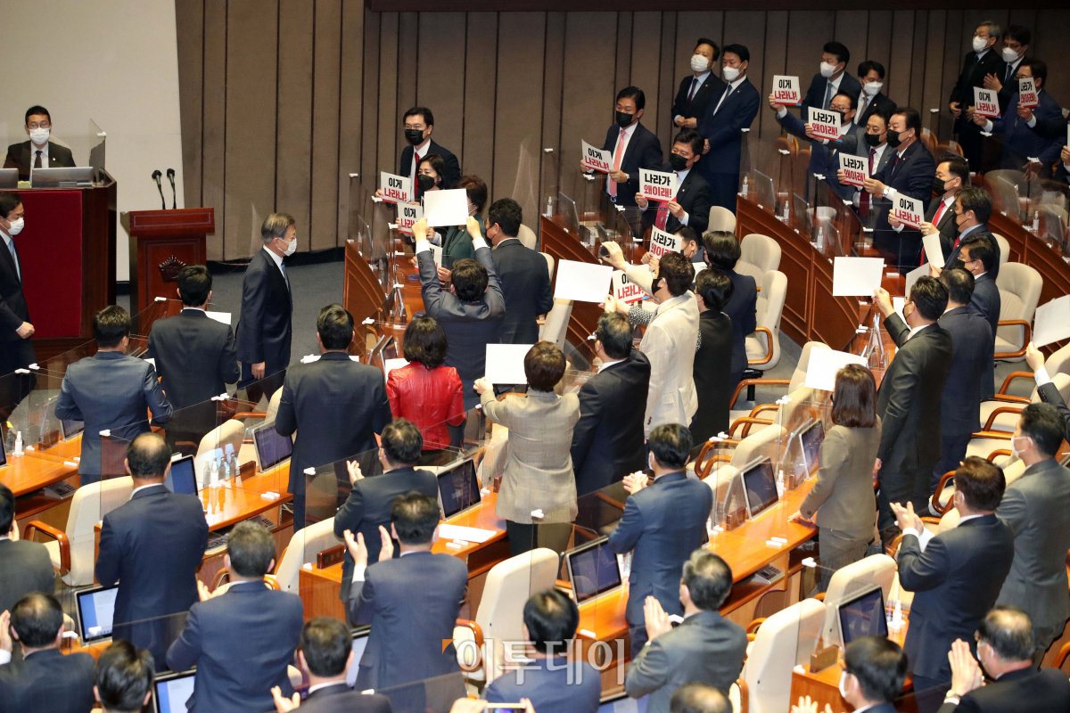 문재인 대통령이 28일 오후 서울 여의도 국회에서 내년도 정부 예산안 시정연설을 마친 후 더불어민주당 의원들의 박수와 국민의힘 의원들의 항의를 받으며 본회의장에서 퇴장하고 있다.
