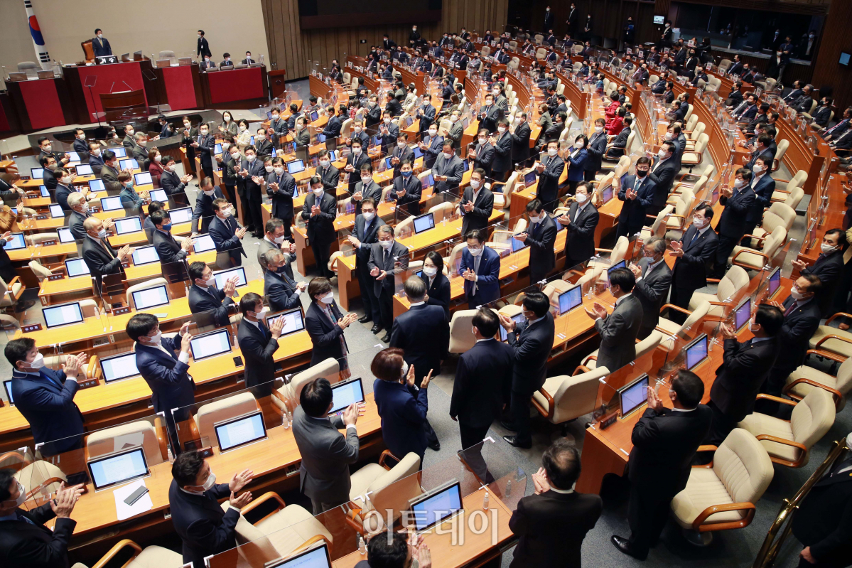 [포토] 여당 의원들 박수 받으며 입장하는 문재인 대통령