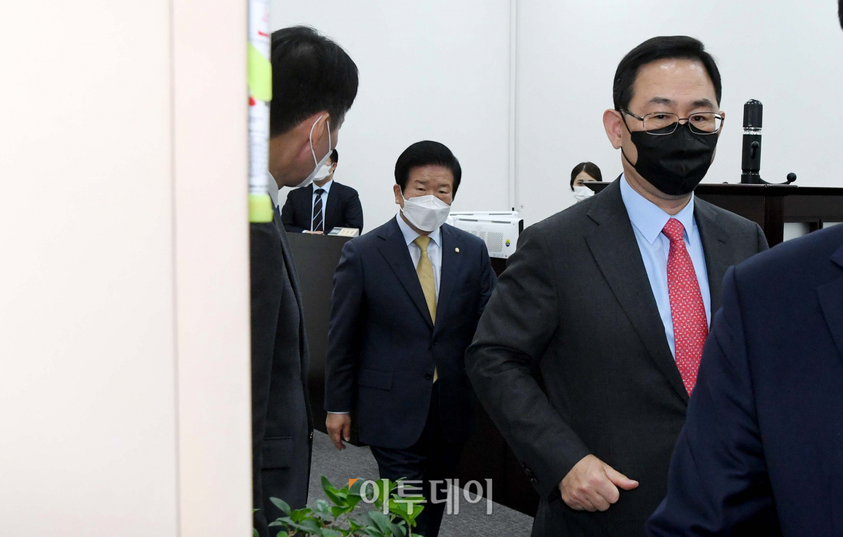 주호영(오른쪽) 국민의힘 원내대표가 28일 서울 여의도 국회 의장실에서 박병석(왼쪽) 국회의장과 면담한 뒤 나서고 있다.