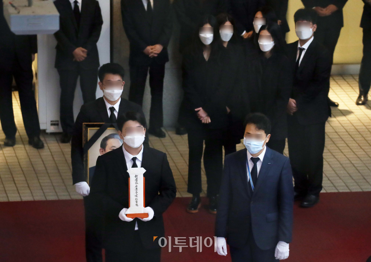 故 이건희 삼성그룹 회장의 발인식이 28일 오전 서울 강남구 삼성서울병원 장례식장에서 엄수된 가운데 유가족과 관계자들이 고인의 영정을 모시고 있다. 사진공동취재단