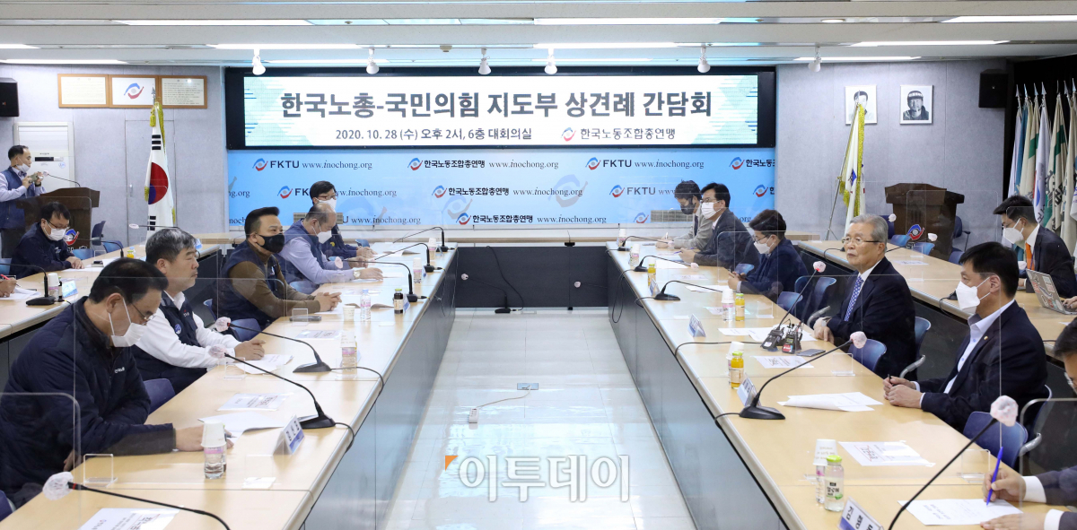 김종인 국민의힘 비상대책위원장이 28일 오후 서울 영등포구 한국노총을 방문해 지도부 상견례 간담회를 하기에 앞서 김동명 한노총 위원장 등 참석자들에 인사말을 하고 있다.