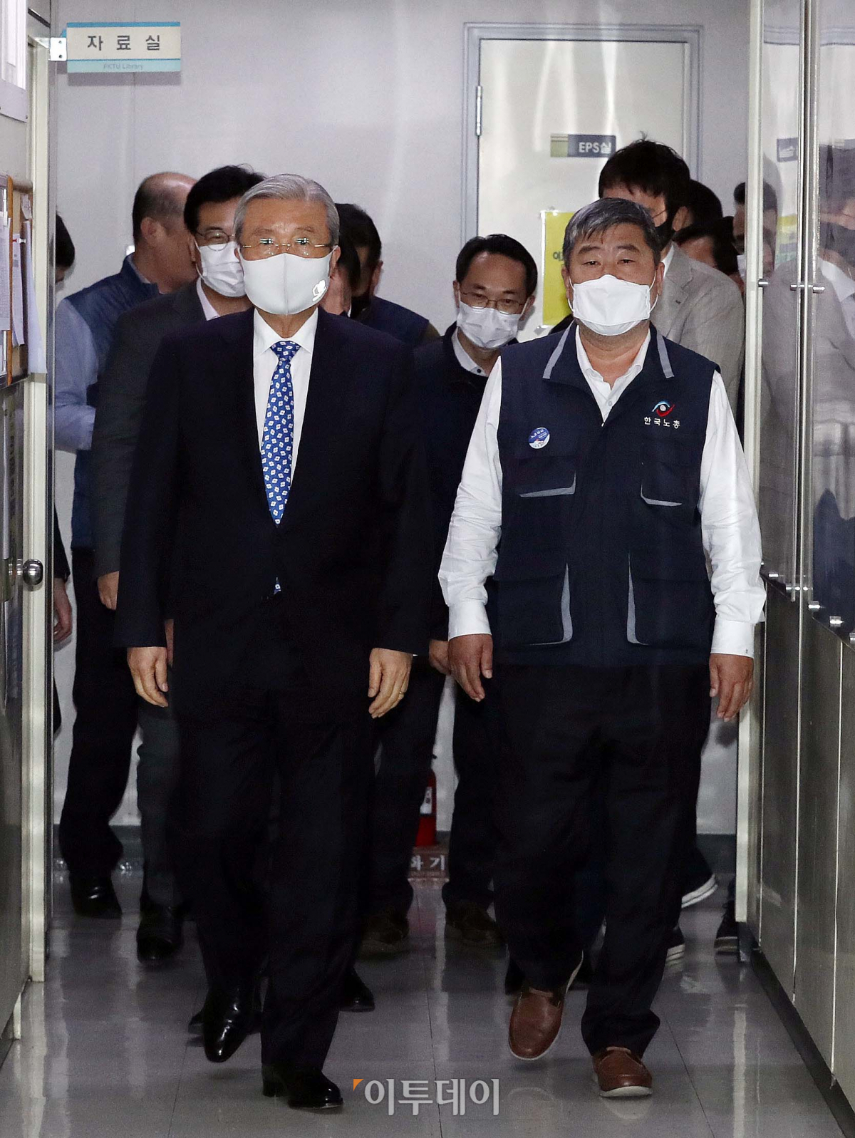 김종인 국민의힘 비상대책위원장(왼쪽)이 28일 오후 서울 여의도 한국노동조합총연맹을 방문해 김동명 위원장과 간담회를 갖기 위해 회의장으로 이동하고 있다.