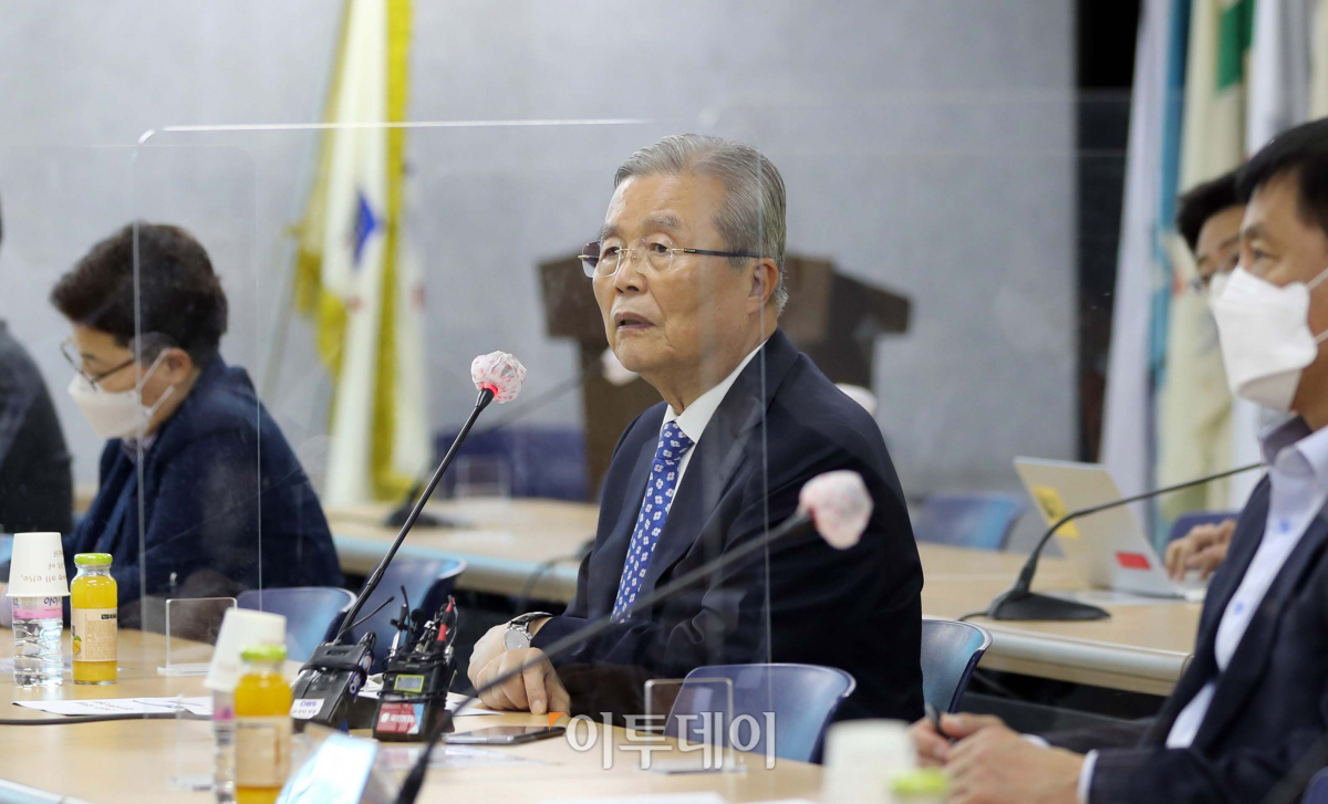 김종인 국민의힘 비상대책위원장이 28일 오후 서울 영등포구 한국노총을 방문해 한노총 지도부 상견례 간담회를 하고 있다.