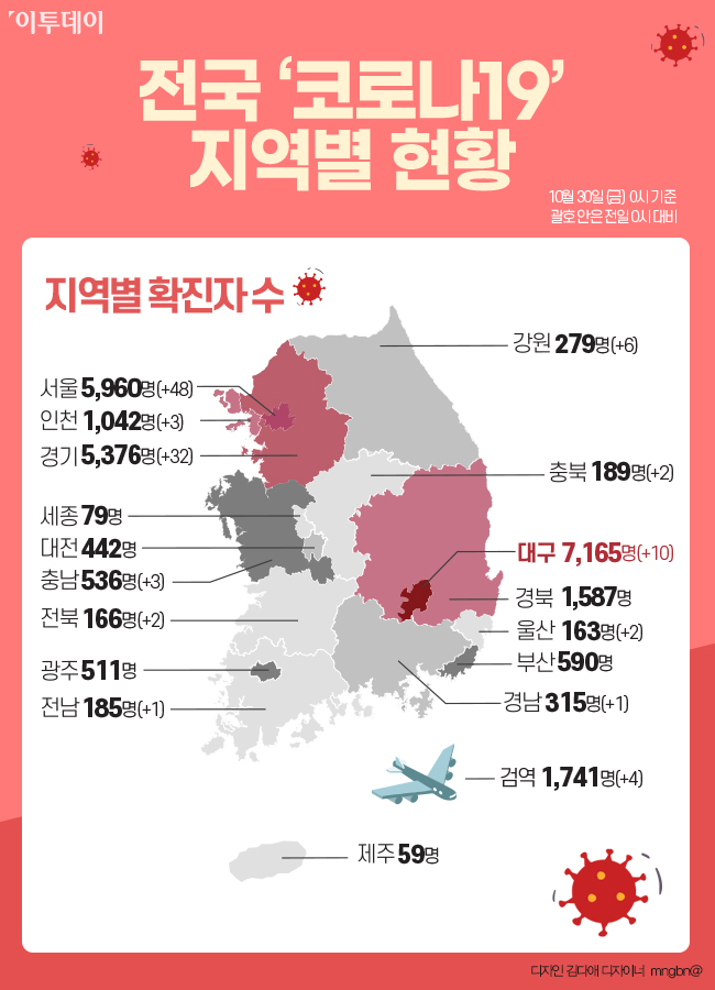 이로써 전국 시·도별 '코로나19' 확진자 수는 △대구 7165명 △서울 5960명으로 가장 많은 비중을 차지했다. 이어 △경기 5376명 △검역소 1741명 △경북 1587명 △인천 1042명 △부산 590명 △충남 536명 △광주 511명 △대전 442명 △경남 315명 △강원 279명 △충북 189명 △전남 185명 △전북 166명 △울산 163명 △세종 79명 △제주 59명 순으로 나타났다.