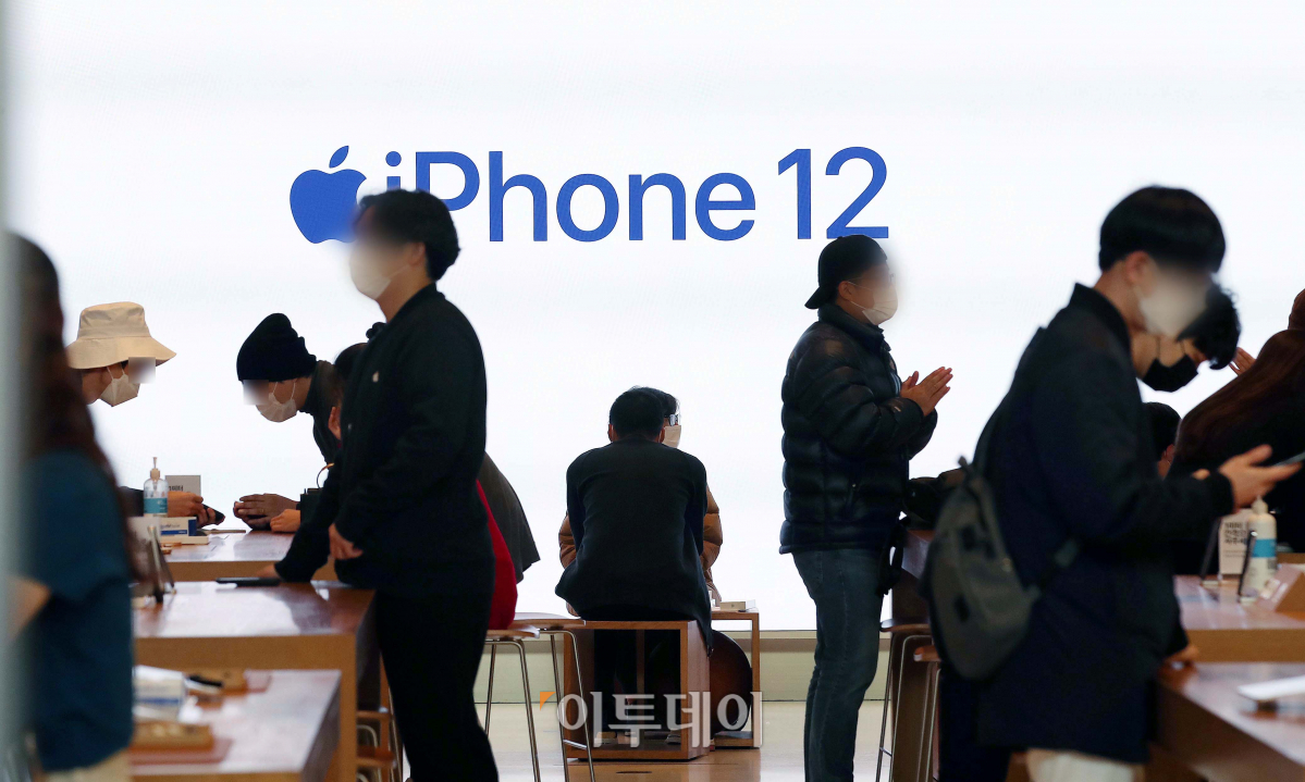 애플 아이폰12, 아이폰12 프로 국내 출시일인 30일 서울 강남구 애플 가로수길에서 시민들이 아이폰 시리즈를 살펴보고 있다.
