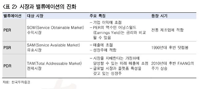 단순 시장의 흐름을 짚는 것을 넘어서 밸류에이션 측정 지표로 PDR을 정의해 특허청에 상표 등록까지 한 증권사도 생겨났다. 한국투자증권은 이달 중순 “PDR은 기업의 주가를 정당화하기 위해 제시하는 지표가 아니라 새로운 가치평가 모델을 찾는 과정에서 나타난 패러다임의 변화로 봐야 한다”며 “기업공개(IPO) 등에서 성장성은 높지만, 아직 이익이 나지 않는 비상장사들의 가치를 평가할 때 활용될 수 있을 것”이라고 말했다.