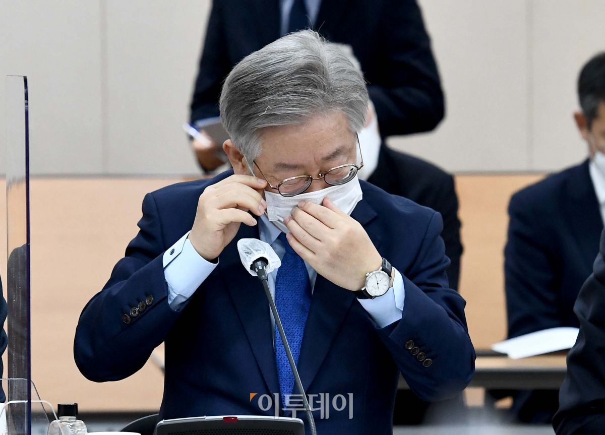 이재명 경기지사가 2일 서울 여의도 이룸센터에서 열린 경기도 국회의원 초청 예산정책협의회에서 마스크를 고쳐쓰고 있다.