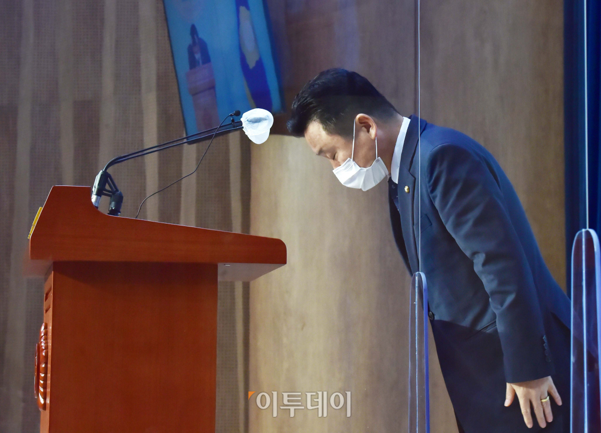더불어민주당 최인호 수석대변인이 2일 오전 서울 여의도 국회 기자회견장에서 더불어민주당 '서울·부산 재보궐 공천' 당원투표에 대한 결과 발표에 앞서 인사하고 있다. 한편 더불어민주당이 지난 주말 동안 실시한 '서울·부산 재보궐 공천' 여부를 묻는 전당원 투표에서 86%가 찬성했다.