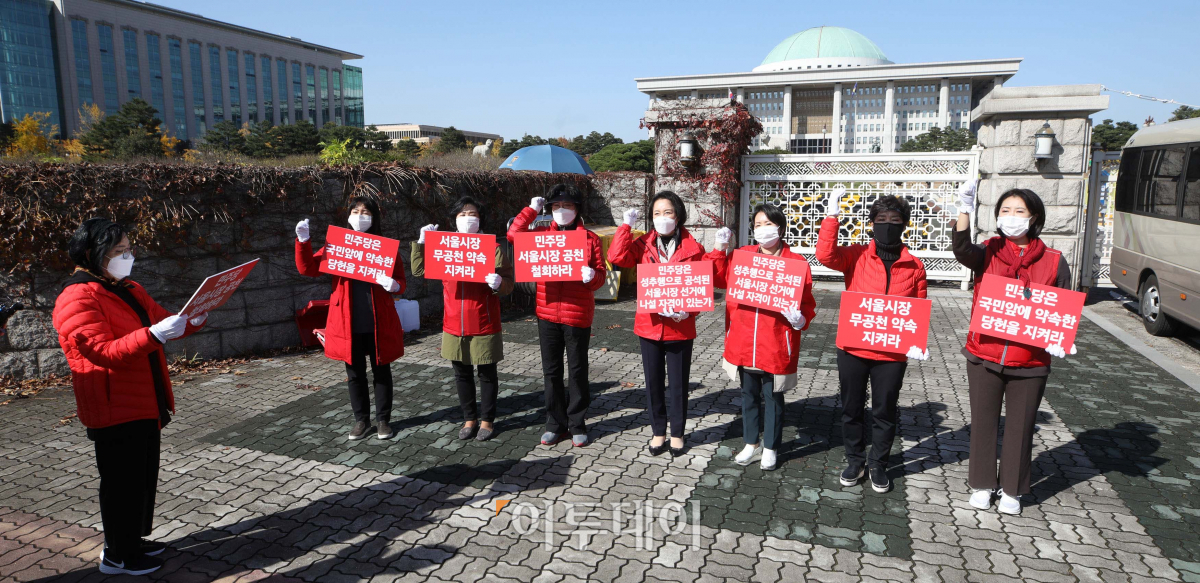 국민의힘 서울시당 여성위원회 임원들이 2일 오후 서울 여의도 국회 앞에서 더불어민주당의 서울시장 공천 철회를 요구하는 피켓시위를 벌이고 있다.