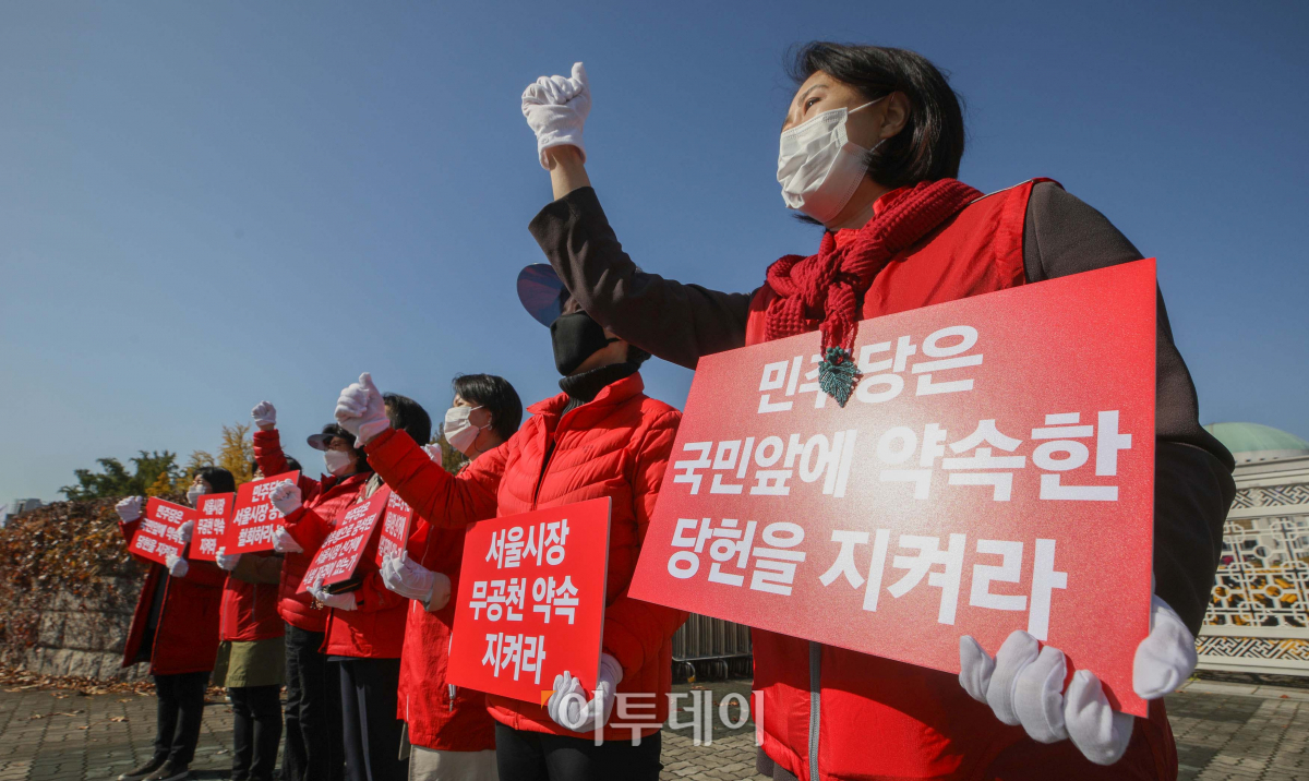 국민의힘 서울시당 여성위원회 임원들이 2일 오후 서울 여의도 국회 앞에서 더불어민주당의 서울시장 공천 철회를 요구하는 피켓시위를 벌이고 있다.