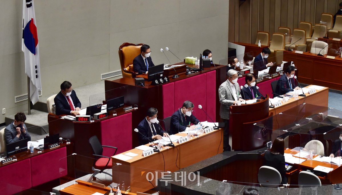 강남훈 한신대 교수가 2일 서울 여의도 국회 본관 예결회의장에서 열린 제382회 국회(정기회) 제4차 예산결산특별위원회, 2021년도 예산안 및 기금운용계획안에 대한 공청회에 참석, 제안설명을 하고 있다.