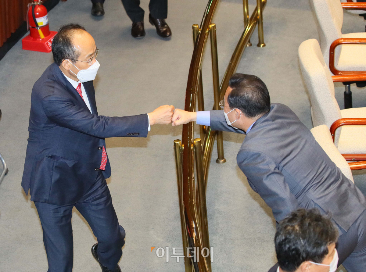 더불어민주당 박홍근 간사(오른쪽)와 국민의힘 추경호 간사가 2일 국회 예결위 전체회의장에서 열린 예산결산특별위원회의 '2021년도 예산안 및 기금운용계획안에 대한 공청회'에서 인사하고 있다.