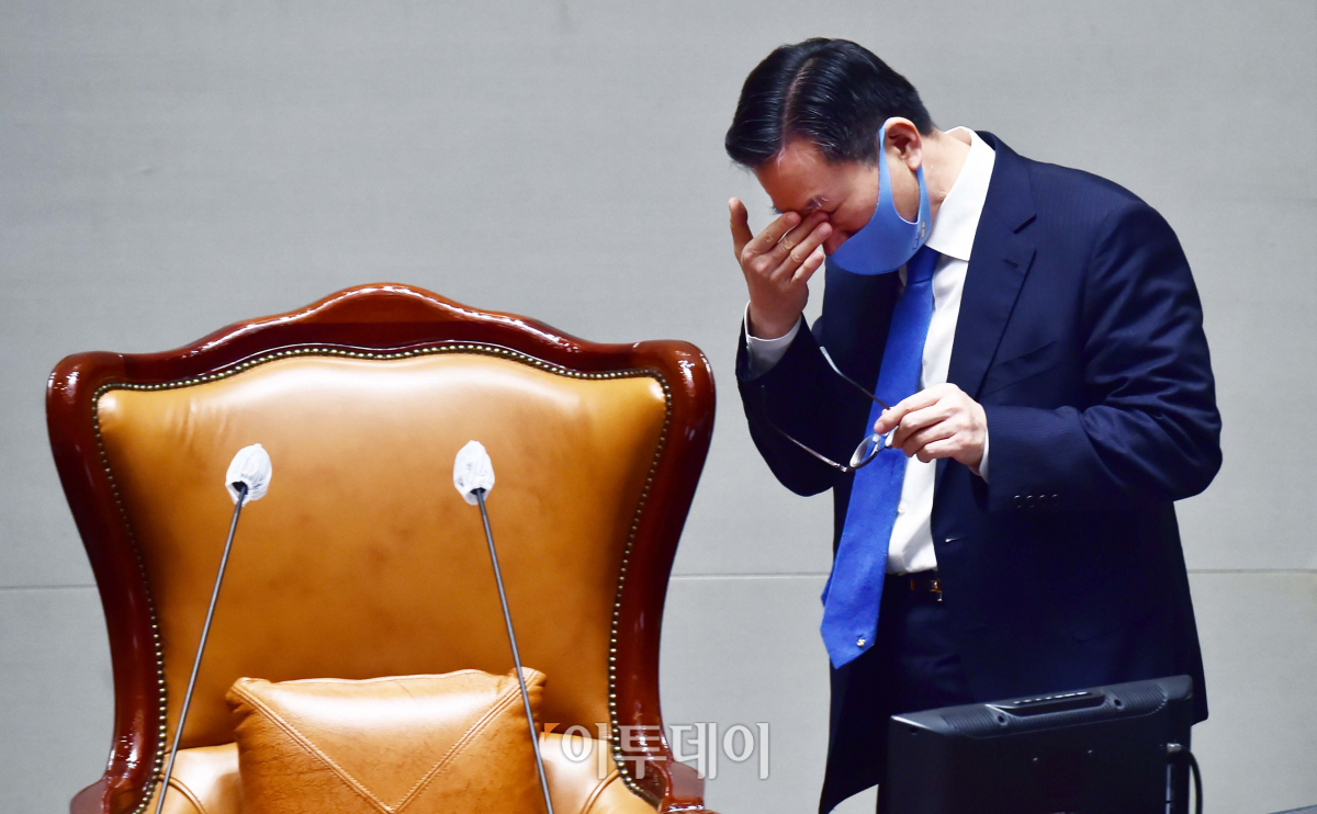 정성호 위원장이 2일 서울 여의도 국회 본관 예결회의장에서 열린 제382회 국회(정기회) 제4차 예산결산특별위원회, 2021년도 예산안 및 기금운용계획안에 대한 공청회 주재를 하기 위해 위원장석으로 이동하고 있다.