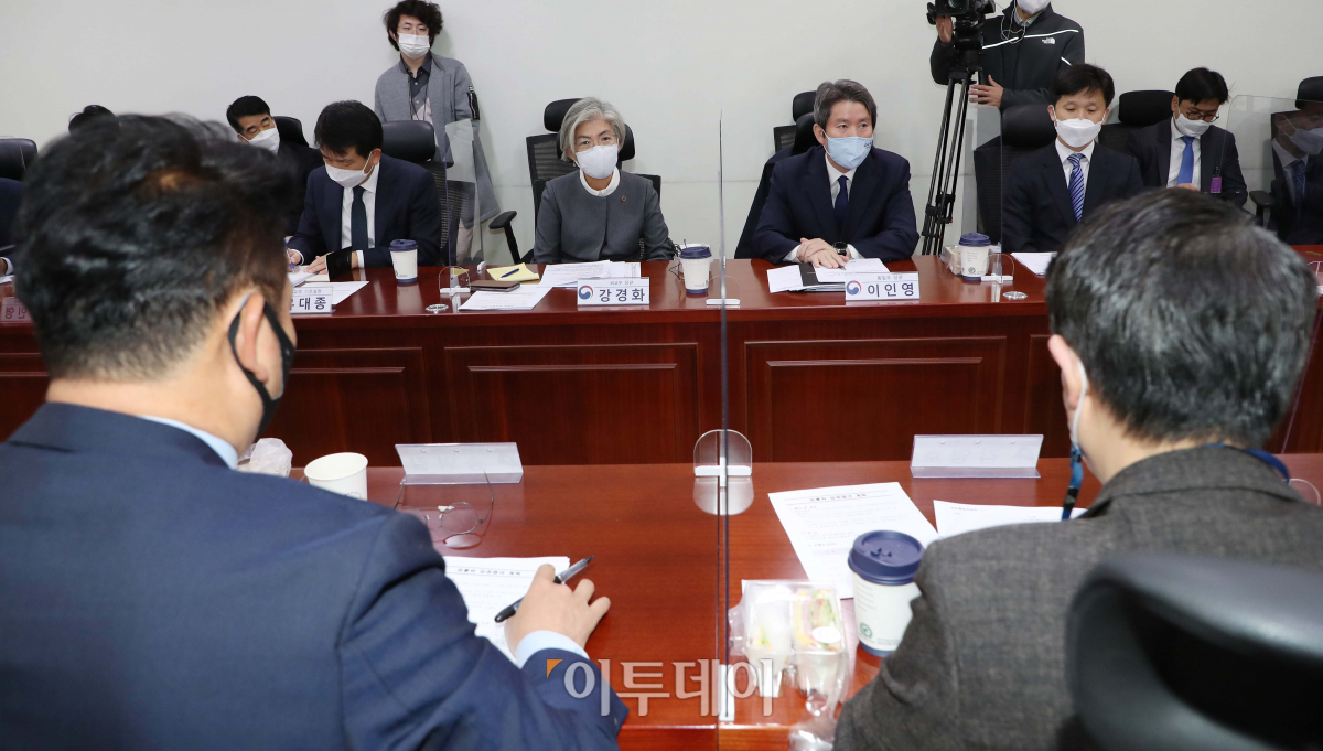 3일 오전 서울 여의도 국회 의원회관에서 열린 더불어민주당 외교통일위원회 당정협의에서 송영길 외통위원장과 강경화 외교부 장관, 이인영 통일부 장관이 대화를 하고 있다.