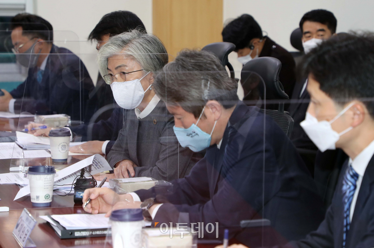 강경화 외교부 장관이 3일 오전 서울 여의도 국회 의원회관에서 열린 더불어민주당 외교통일위원회 당정협의에서 모두발언을 하고 있다.