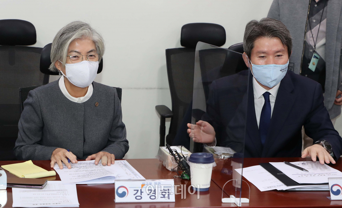 강경화 외교부 장관과 이인영 통일부 장관이 3일 오전 서울 여의도 국회 의원회관에서 열린 더불어민주당 외교통일위원회 당정협의에 참석해 대화를 하고 있다.